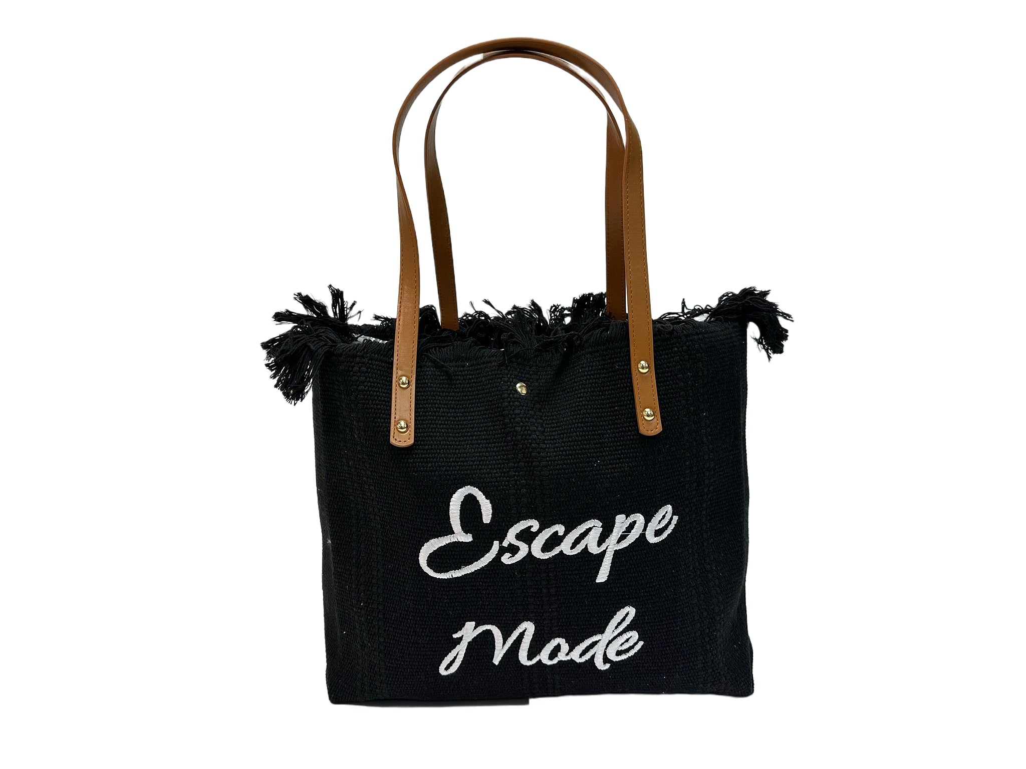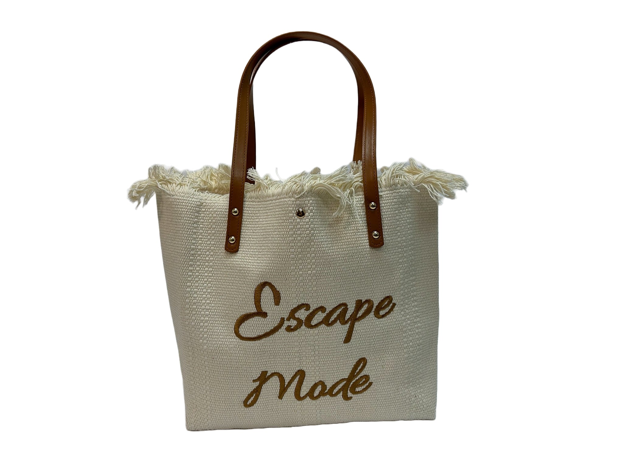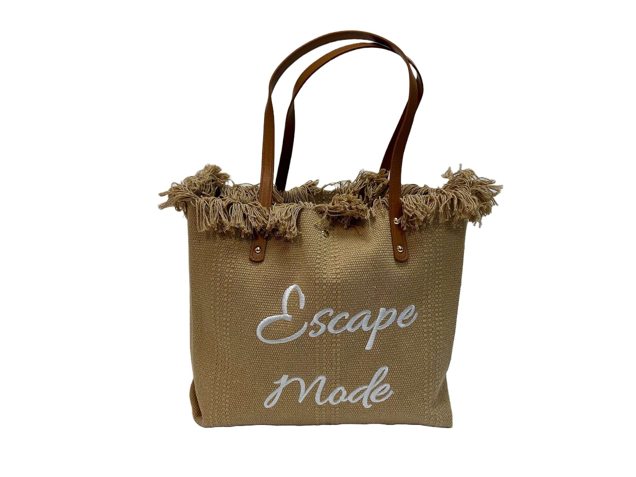 Set your sights on adventure with the "Escape Mode" canvas tote bag. Featuring stylish text design, leather straps, and fringe detailing, this bag is perfect for carrying essentials on any getaway.
