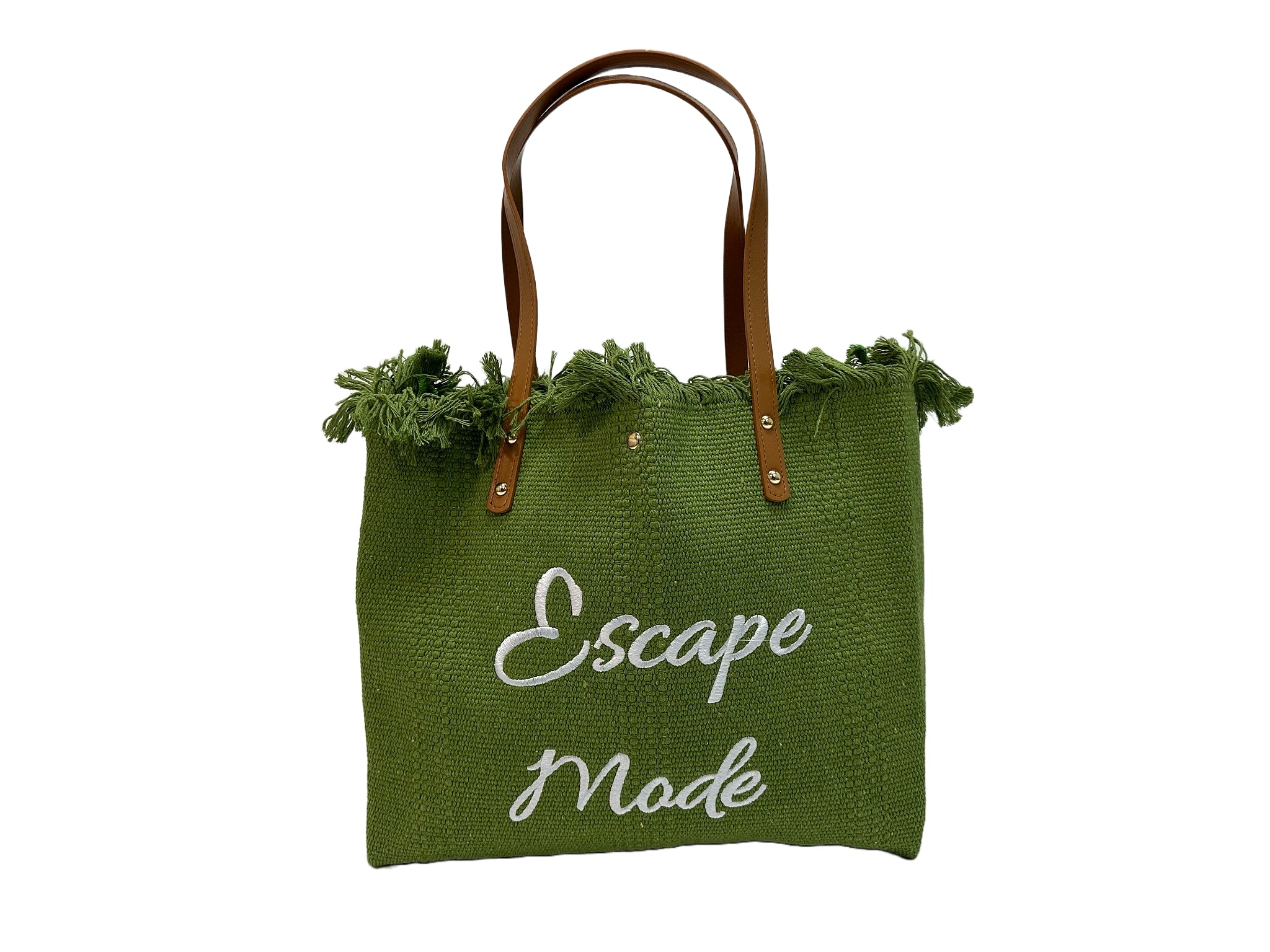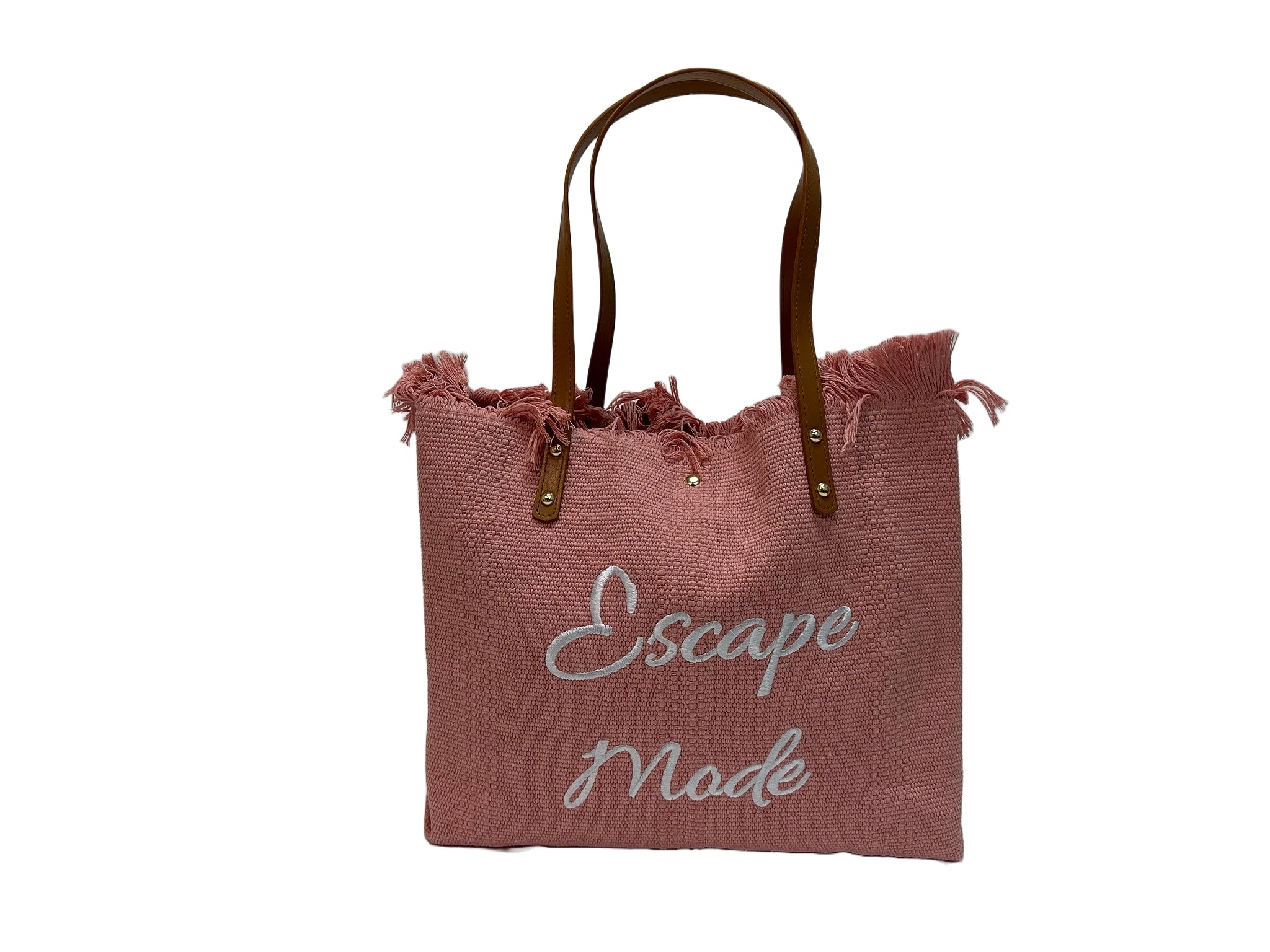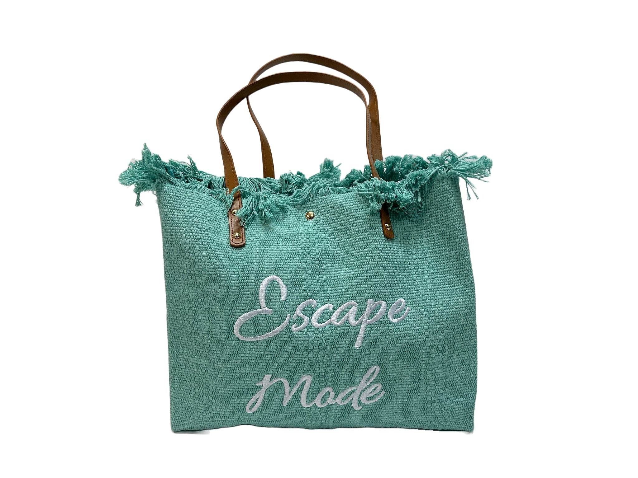 Set your sights on adventure with the "Escape Mode" canvas tote bag. Featuring stylish text design, leather straps, and fringe detailing, this bag is perfect for carrying essentials on any getaway.