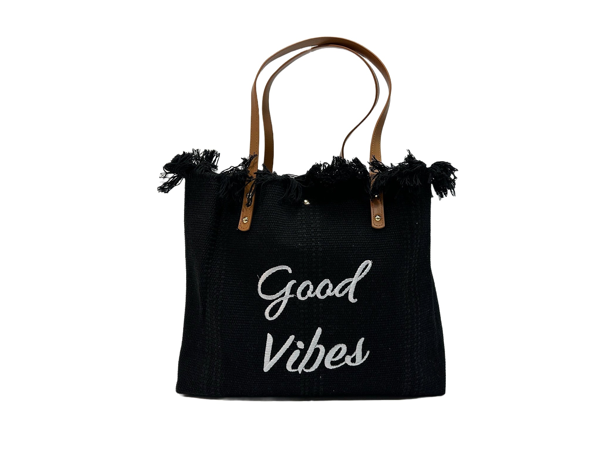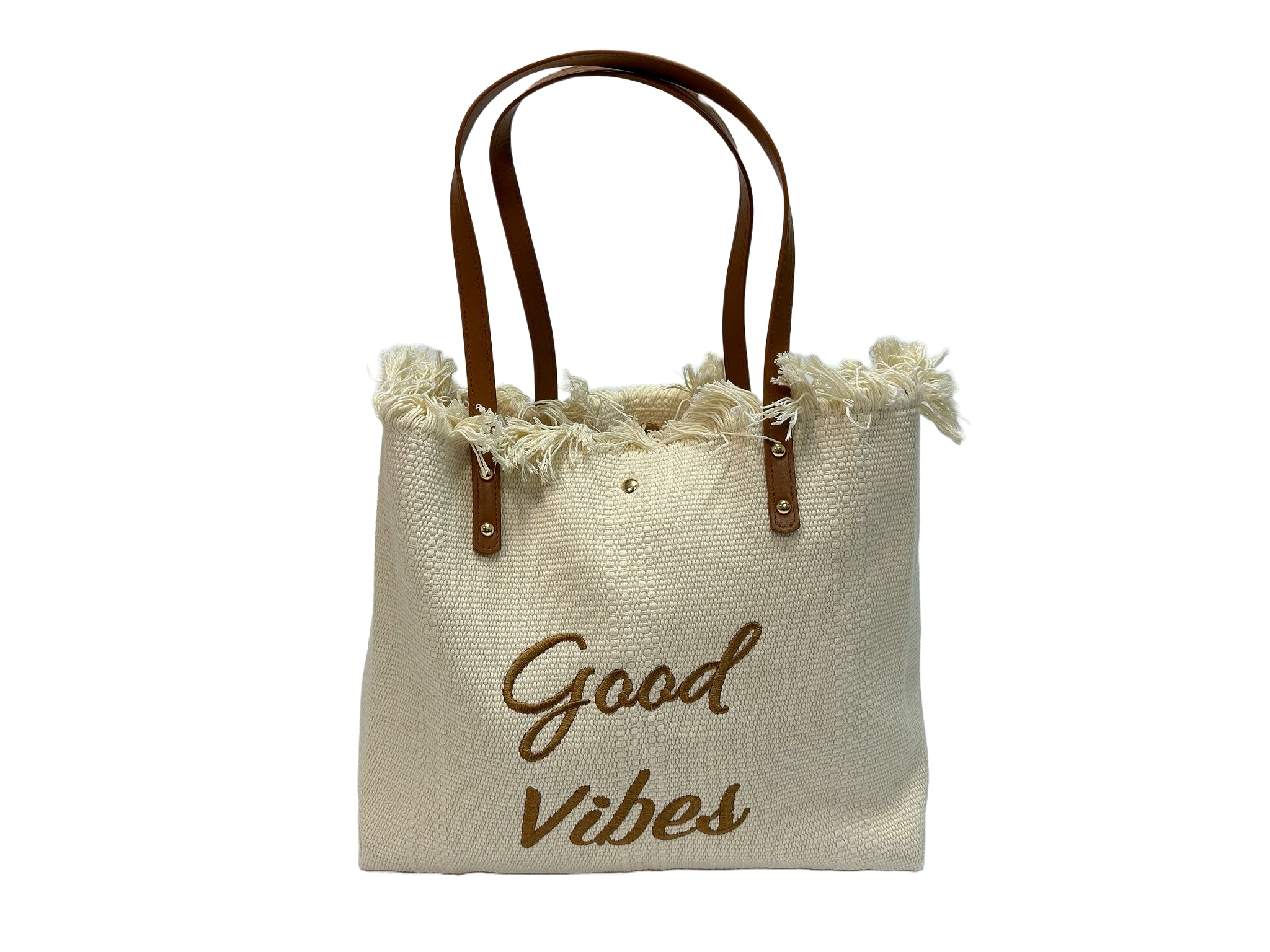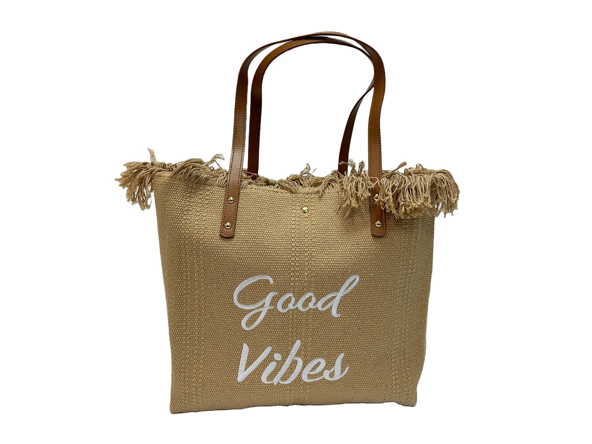 Spread positivity with the "Good Vibes" canvas tote bag. Its soft hue, fringe accents, and sturdy leather straps make it a standout accessory for shopping, travel, or casual use. A perfect blend of practicality and uplifting style.