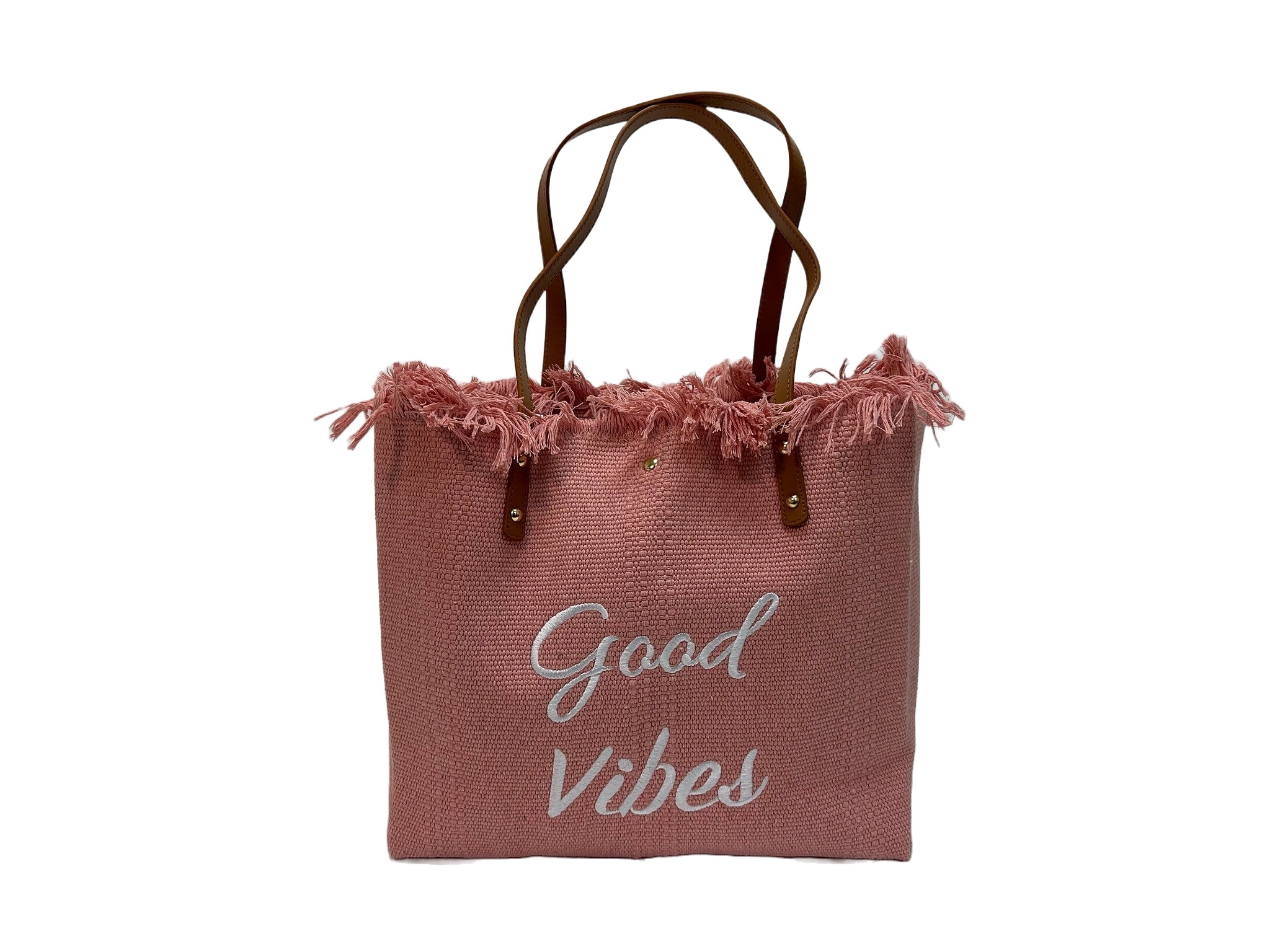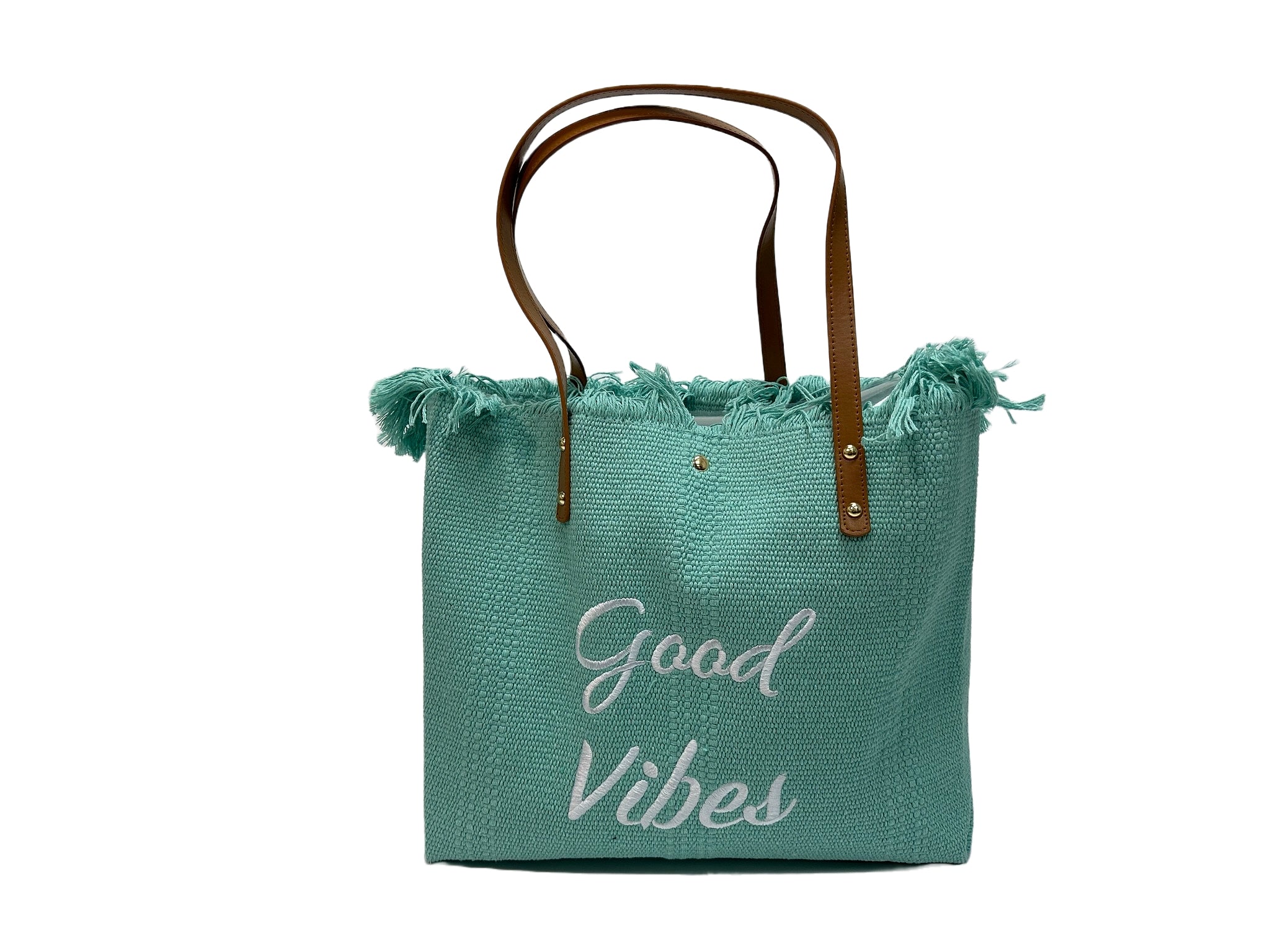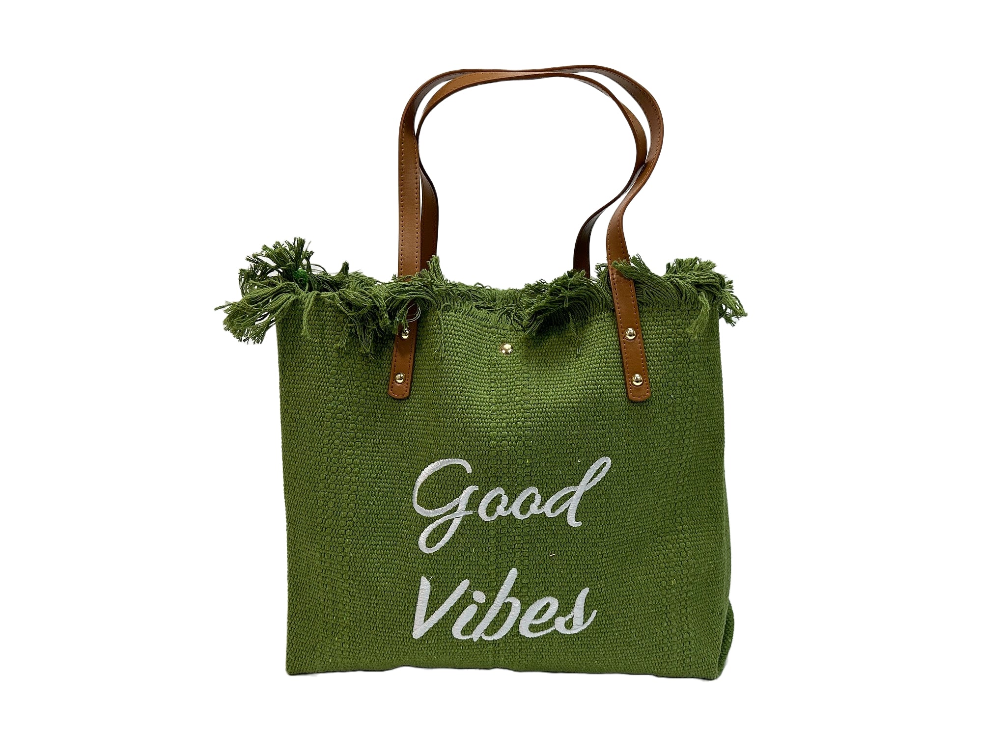 Spread positivity with the "Good Vibes" canvas tote bag. Its soft hue, fringe accents, and sturdy leather straps make it a standout accessory for shopping, travel, or casual use. A perfect blend of practicality and uplifting style.