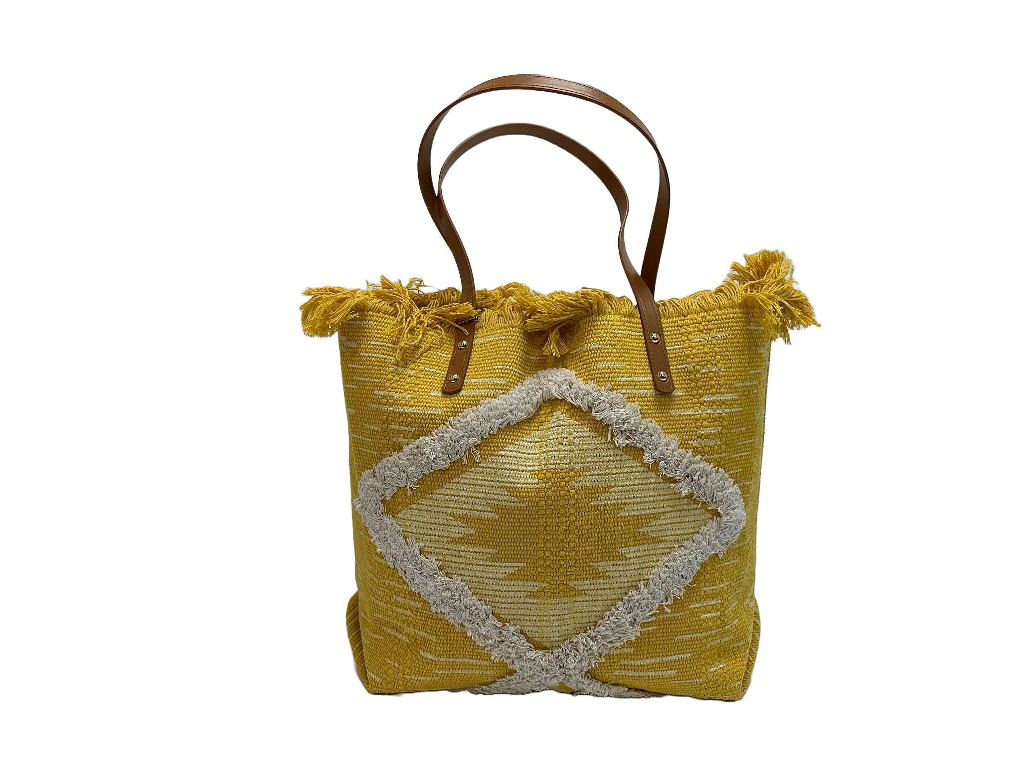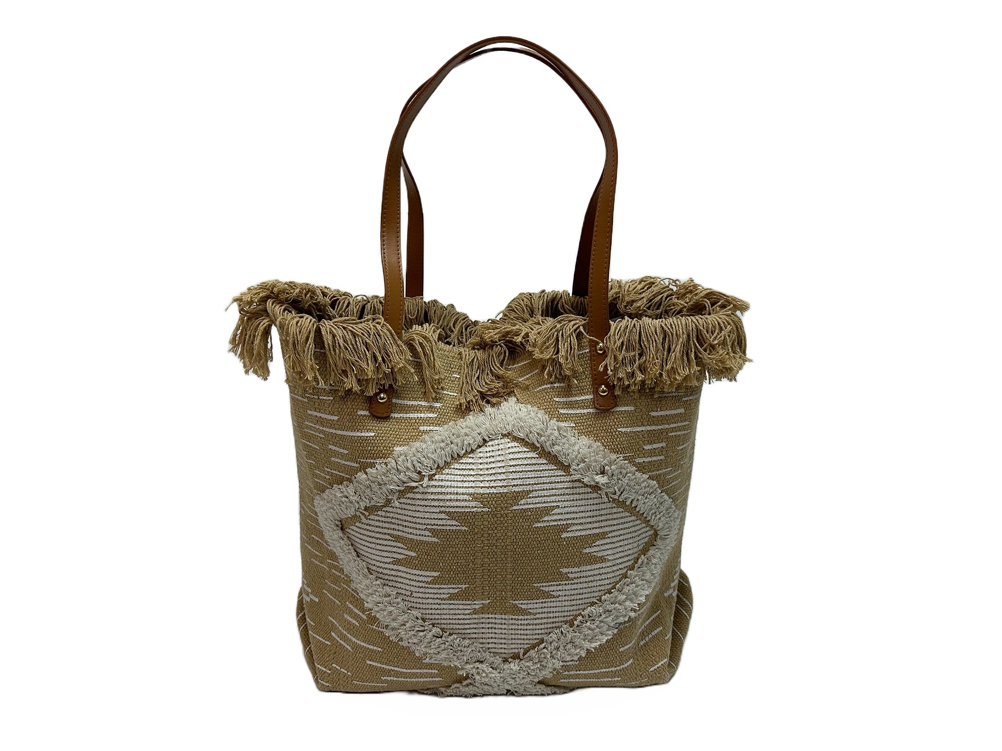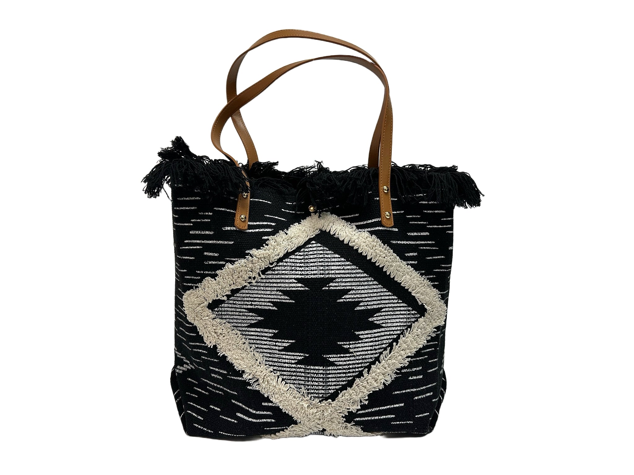 Stand out with this geometric diamond canvas tote bag. Featuring a bold pattern and stylish fringe detailing, this tote offers both practicality and elegance. Ideal for errands, travel, or adding a unique touch to your outfit.