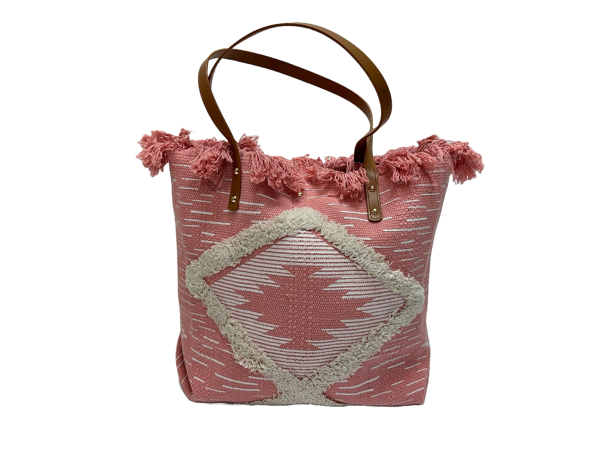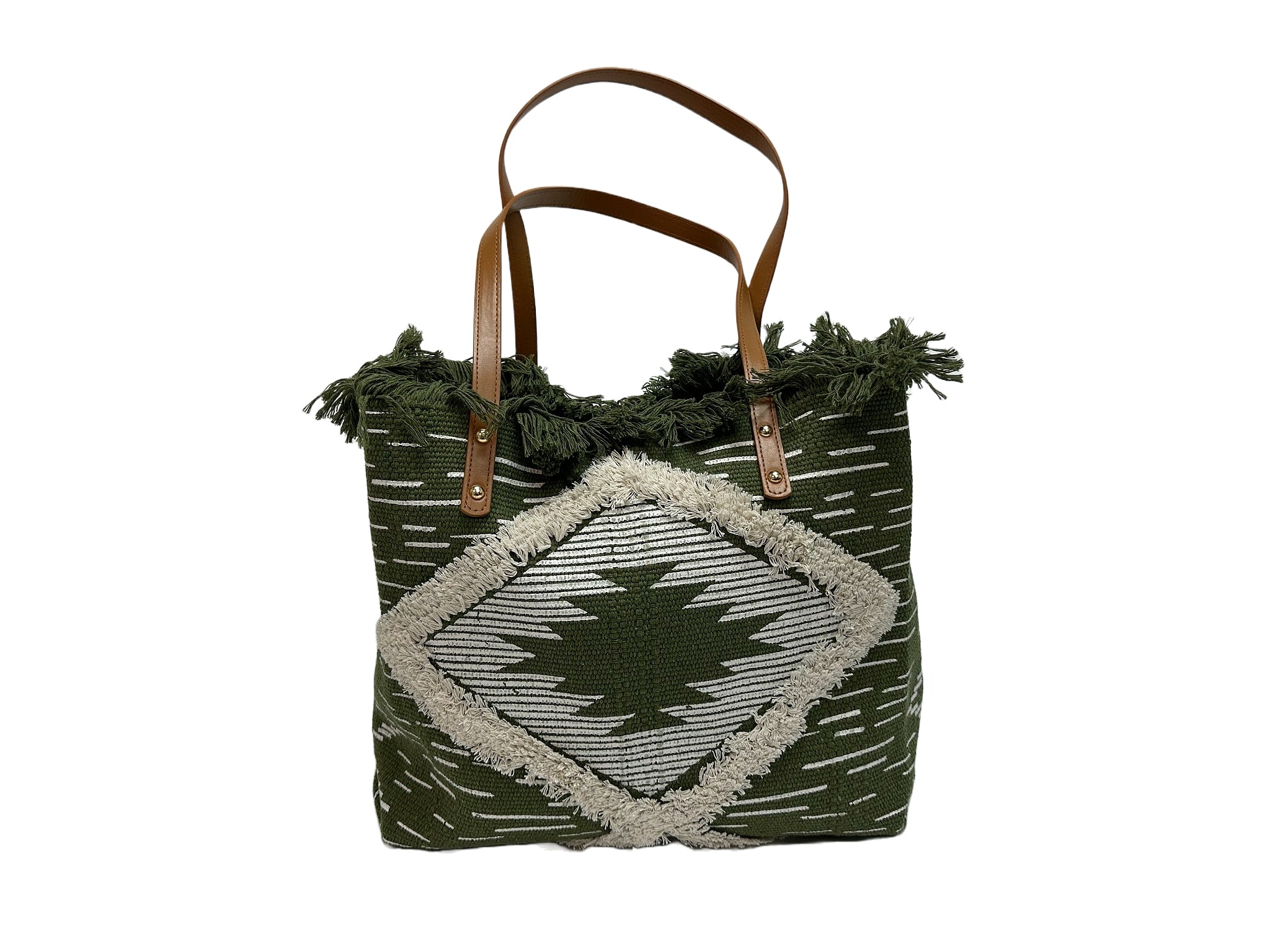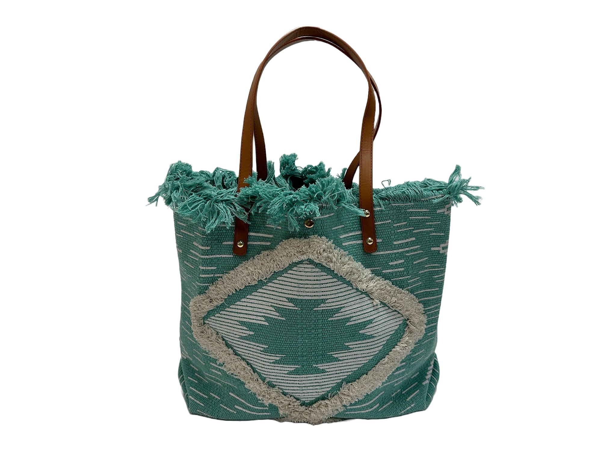Stand out with this geometric diamond canvas tote bag. Featuring a bold pattern and stylish fringe detailing, this tote offers both practicality and elegance. Ideal for errands, travel, or adding a unique touch to your outfit.