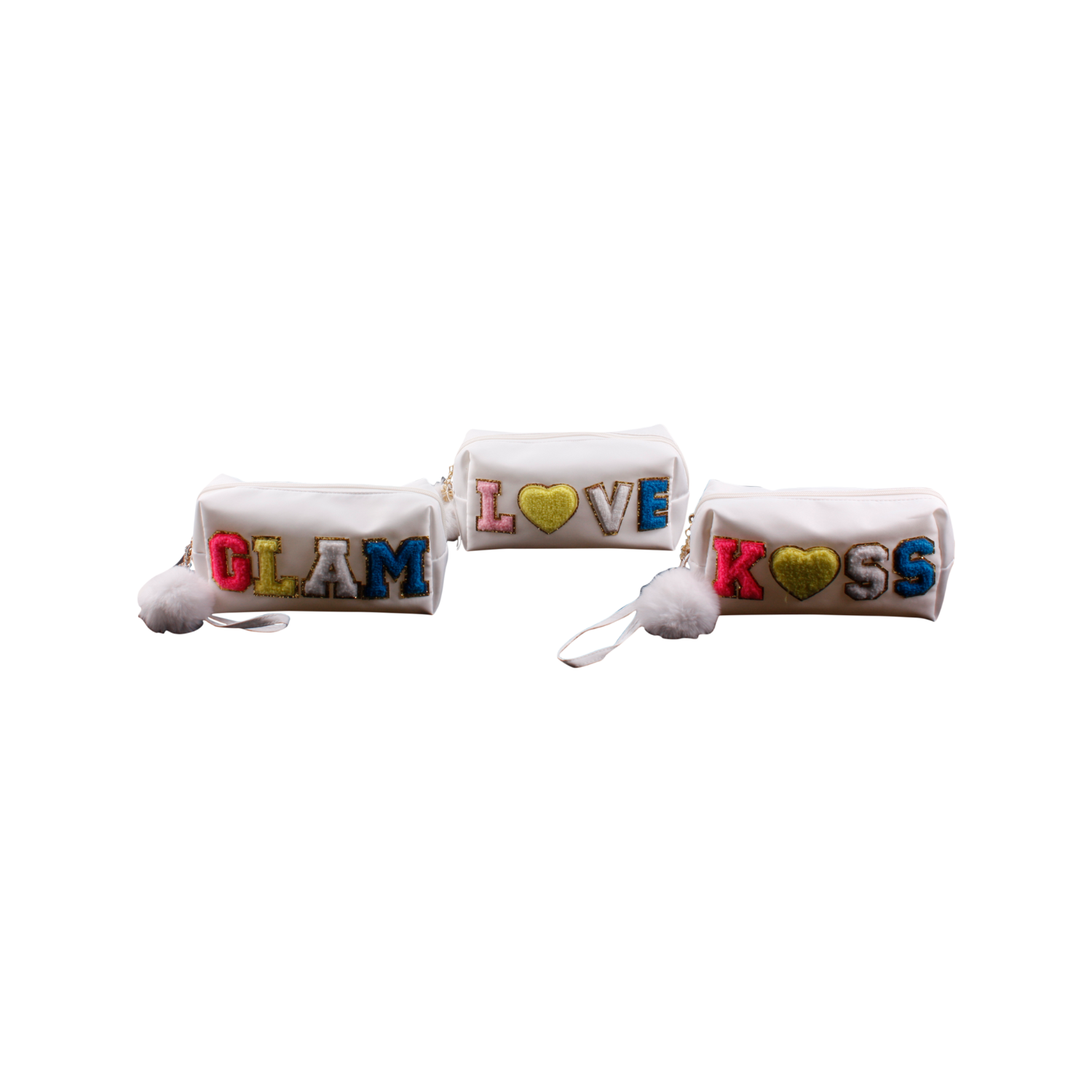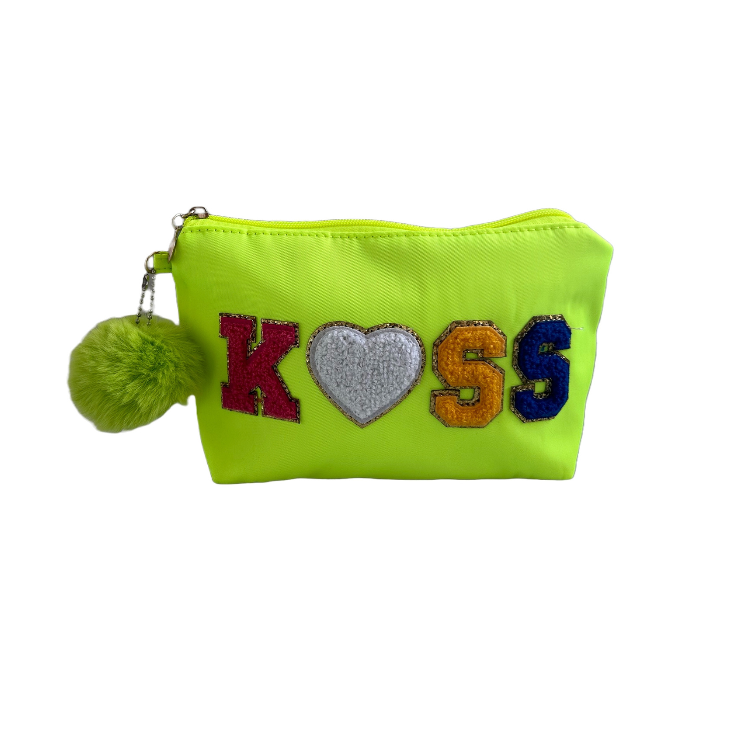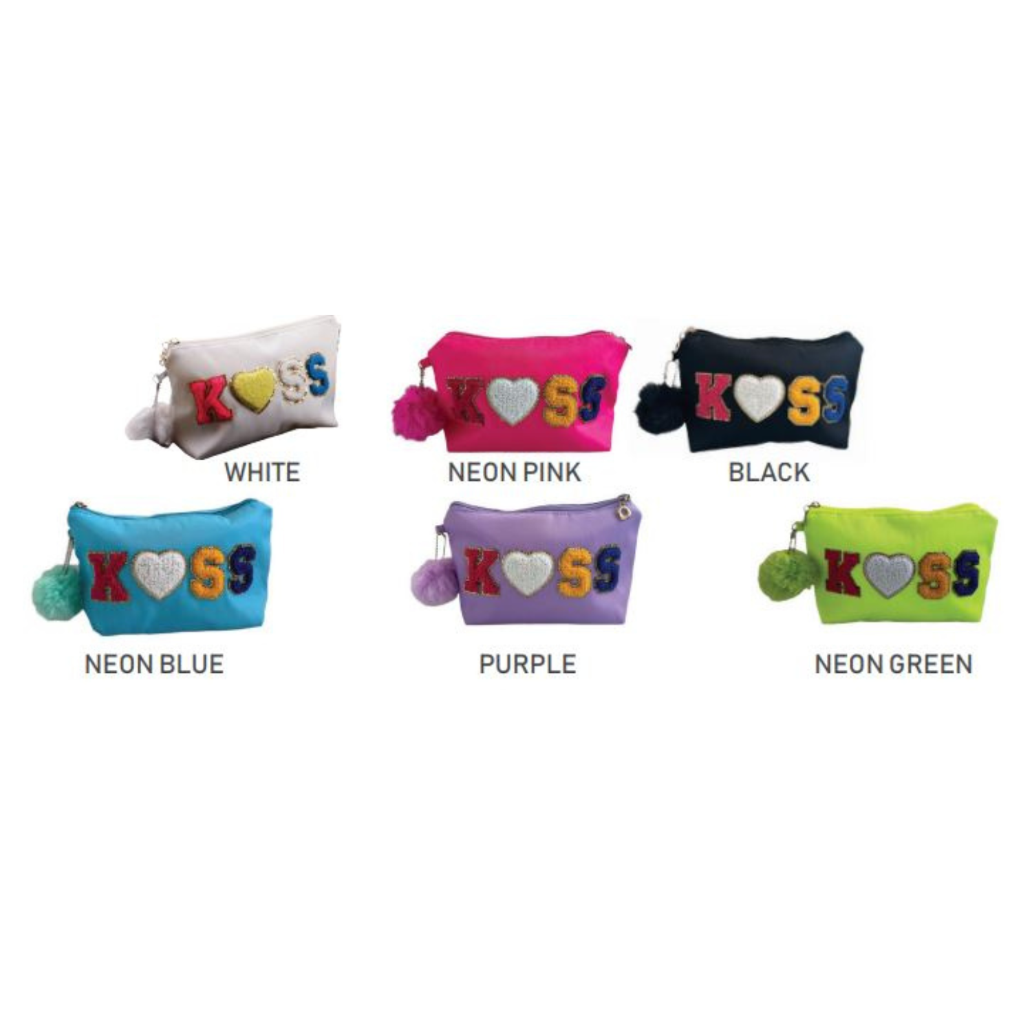 Make a statement with the "KISS" glitter wristlet pouch. Designed with bold lettering and a compact size, this pouch is perfect for keeping small essentials organized in style.